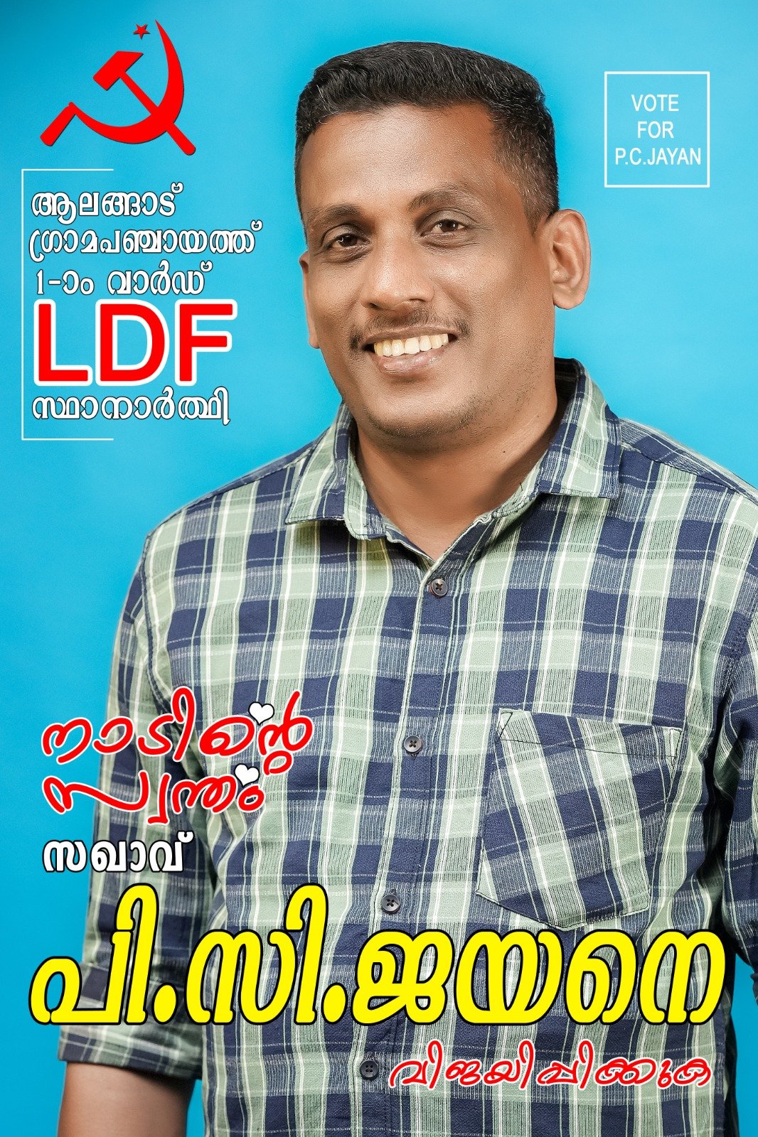 ആലങ്ങാട്: ആലങ്ങാട് ഗ്രാമപഞ്ചായത്തിലെ ഒന്നാം വാർഡിൽ എൽഡിഎഫിനായി ജനപിന്തുണ തേടുന്നത് നാട്ടുകാർക്കെല്ലാം ഒരേ പോലെ പ്രിയങ്കരനായ പി സി ജയനാണ്. ചെറുപ്പകാലം മുതൽ തന്നെ വിദ്യാഭ്യാസ രാഷ്ട്രീയത്തിൽ പ്രവർത്തിച്ചു വന്ന വ്യക്തിയാണ് ഇദ്ദേഹം. എസ്എഫ്ഐയുടെയും ഡിവൈഎഫ്ഐയുടെയും പ്രവർത്തകനായി ഇദ്ദേഹം പ്രവർത്തിച്ചിട്ടുണ്ട്. മുൻപ് ഡിവൈഎഫ്ഐയുടെ സെക്രട്ടറി സ്ഥാനവും അദ്ദേഹം വഹിച്ചിരുന്നു. നിലവിൽ പാർട്ടി മെമ്പറാണ്.